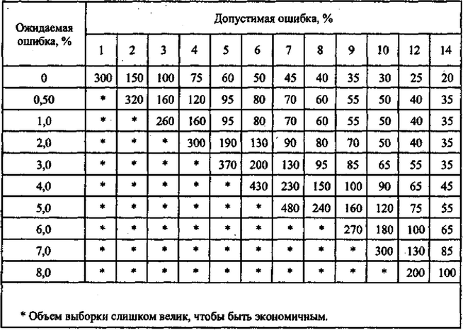 в) допустимая ошибка (% генеральной совокупности). Далее, объем выборки определяется с применением таблицы,
