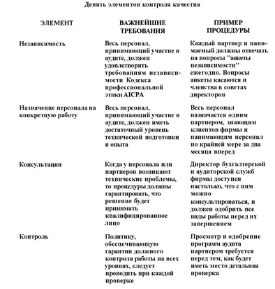 Комитет стандартов контроля качества определил 9 основных элементов контроля качества, которые фирмы должны учитывать при разработке своей политики и процедур. Эти элементы перечислены в табл. 1.2 с кратким описанием требований для каждого элемента и примером процедуры контроля качества, которую фирма могла бы использовать для выполнения этого требования.