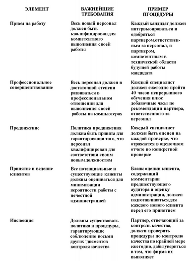 ЭЛЕМЕНТЫ КОНТРОЛЯ КАЧЕСТВА. AICPA не установил специальные процедуры контроля качества для аудиторских фирм. Какие процедуры применять, зависит от размера фирмы, количества офисов и вида практики. Например, процедуры контроля качества работы международной фирмы со 150 офисами, множеством крупных многонациональных клиентов должны значительно отличаться от процедур контроля качества работы фирмы, в которой заняты 5 человек, специализирующихся на небольших проверках в одной или двух отраслях промышленности.