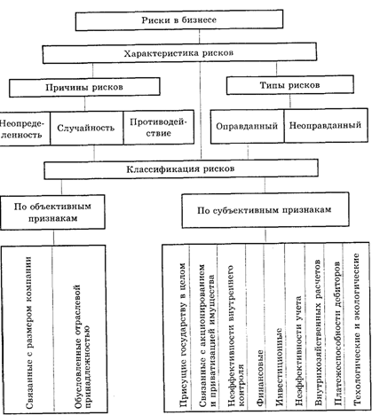 риски в бизнесе классифицируют на присущие государству в целом; связанные с акционированием и приватизацией имущества; неэффективностью внутреннего контроля; финансовые; инвестиционные; неэффективности учета; внутрихозяйственных расчетов; степени платежеспособности дебиторов; технологические и экологические.