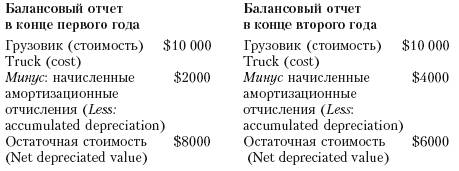 Осуществление затрат на приобретение недвижимости, основных производственных средств и оборудования должно быть распределено на период ожидаемого срока их службы. Например, если грузовая машина стоит $10 тыс. и ожидается, что она прослужит 5 лет, тогда, используя «прямолинейный» метод амортизационных отчислений, можно определить, что стоимость грузовика будет уменьшаться на $2 тыс. каждый год.
