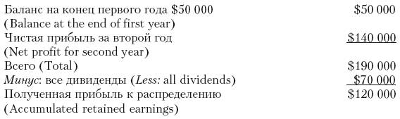 Для объяснения сущности этого понятия необходимо иметь в виду, что в начале своей деятельности компания не имеет прибыли. В конце первого года деятельности, если прибыль компании, например, составит $80 тыс. и по привилегированным акциям будет выплачено дивидендов на сумму $30 тыс., а по обыкновенным акциям не будет объявлено дивидендов, то полученная прибыль к распределению составит $50 тыс. Теперь перейдем ко второму году деятельности. Предположим, что прибыль в этом случае достигнет $140 тыс., по привилегированным и обыкновенным акциям будут выплачены дивиденды на сумму $30 тыс. и $40 тыс. соответственно. Тогда прибыль к распределению составит $120 тыс.