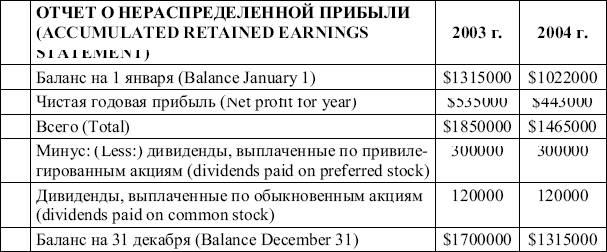 Показатель нераспределенной прибыли (табл. 2.14) с учетом его изменений и корректировок служит связующим звеном между балансовыми отчетами предыдущего и данного учетных периодов. GAAP рекомендует прилагать отчет о нераспределенной прибыли (statement of retained earnings или retained earnings statement) к отчету о прибылях и убытках или к балансовому отчету. Некоторые компании представляют его отдельно в виде отчета о состоянии собственного капитала акционеров (statement of owners' equity).