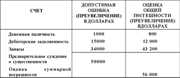 Для оформления предшрительного суждения о существенности необходим достаточно высокий профессионализм. Допустим, что аудитор начинает проверку с того, что описанным выше способом использует предварительно оцененный критерий существенности 50 000 дол. В первую очередь он подвергает аудиту счета наличных денег и дебиторской задолженности и определяет, что суммарная ошибка по обоим счетам составляет только 4000 дол. В то же время аудитор, по другим соображениям, решает исправить свою оценку существенности на 60 000 дол. Теперь аудитор может исправить величину допустимой ошибки по статье запасов с 34 000 дол. на 56 ССО дат. (60 000 дол. минус 4000 дол.).