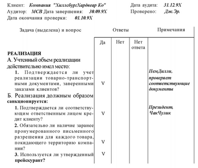 На рис. 9.4 в качестве примера приводится часть анкеты по системе внутрихозяйственного контроля для цикла реализации и получения выручки компании "Хиллсбург Хардвеар Ко". Эта анкета составлена таким образом, что ее можно использовать при работе с семью задачами системы внутрихозяйственного контроля. Обратите внимание, что каждая из этих задач (от А до Ж) конкретна, поскольку имеет отношение к операциям по реализации (смотрите выделенные части). Это же верно и по отношению ко всем остальным областям аудита.