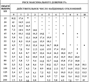 Почему такие большие различия в объеме выборки? Они обуславливаются выборочным риском. Если аудитор обнаружит, что действительная норма отклонения выборки - 2%, имеется небольшой риск того, что даже при незначительной выборке норма совокупности превысит 9%. Если же аудитор выяснит, что действительная норма отклонений выборки 4,5%, есть гораздо больший риск того, что истинная норма превысит 7%. Следовательно, для уменьшения риска необходима более крупная выборка. Посмотрите табл. 12.7. Звездочка показывает пересечение TDR и EPDR, где объемы выборок, вероятно, неэффективны с точки зрения затрат. Во всех случаях TDR минус EPDR будет 3% или меньше.