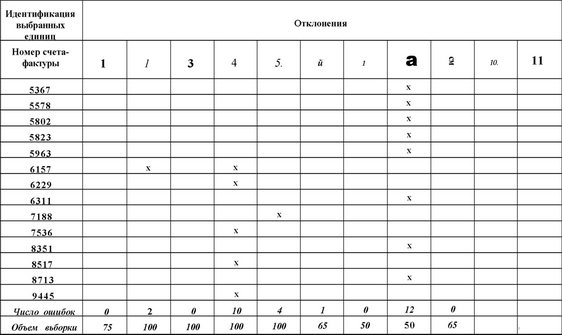 ВЫПОЛНЕНИЕ ПРОЦЕДУРЫ И РАСПРОСТРАНЕНИЕ РЕЗУЛЬТАТОВ НА СОВОКУПНОСТЬ. Аудиторские процедуры, которые включены в программу аудита и обобщены в листе данных качественного выборочного исследования, должны тщательно выполняться для каждой единицы выборки. В качестве средства документирования тестов и обеспечения информации для обзора принято использовать специальный рабочий документ с результатами. Некоторые аудиторы предпочитают включать в рабочую документацию специальный лист, содержащий перечень единиц выборки; другие предпочитают ограничивать документацию по учету отклонений. Этот последний метод используется в примере (рис. 12.4).