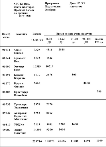Обычно для оценки приемлемости допустимого предела нужно тщательно рассмотреть нетекущие счета пробного баланса по времени и определить, какие из них не были погашены после даты баланса. Объем и срок давности незакрытых остатков можно затем сравнивать с подобной информацией предыдущих лет для оценки того, увеличивалась или уменьшалась с течением времени сумма нетекущей дебиторской задолженности. Просмотр отчетов Дана и Брэдстрита, собеседования с менеджерами по кредитам и обзор переписки клиента также могут дать представление о возможности погашения задолженности. Эти процедуры особенно важны, если небольшое количество крупных сальдо не является текущим и не погашается регулярно.