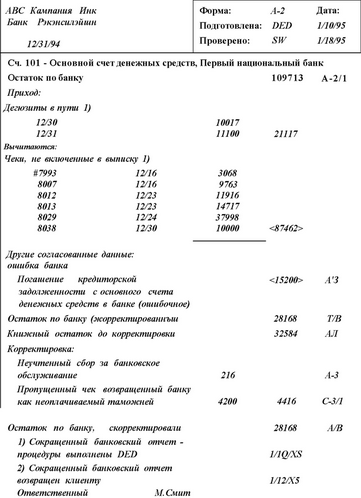 АУДИТОРСКИЕ ПРОЦЕДУРЫ ДЛЯ ДЕНЕЖНЫХ СРЕДСТВ В КОНЦЕ ГОДА Главное, что нужно учитывать при проверке остатка по основному счету денежных средств, - это возможность злоупотреблений. Аудитор должен расширить процедуры проверок денежных средств в конце года, чтобы определить возможность существенных хищений, если система внутрихозяйственного контроля явно слаба (и особенно при неверном разделении обязанностей между кассирами и персоналом, отражающим операции с денежными средствами в учетных регистрах). Изучая состояние денежных средств в следующих разделах, мы подразумеваем, что существует надлежащий внутрихозяйственный контроль по кассе и основному счету денежных средств. Более того, акцент на выявление злоупотреблений не делается. При завершении изучения типичных аудиторских процедур перепроверки денежных средств в конце года исследуются лишь процедуры, направленные на выявление злоупотреблений. Начальным моментом перепроверок остатка по основному счету денежных средств является получение аудитором банковского отчета для данного клиента (с включением его копии в рабочие документы аудитора). На рис 15.4 показана банковская выписка после исправлений. Обратите внимание, что сверху в рабочем документе аудитора обозначен остаток, исправленный по Главной книге.