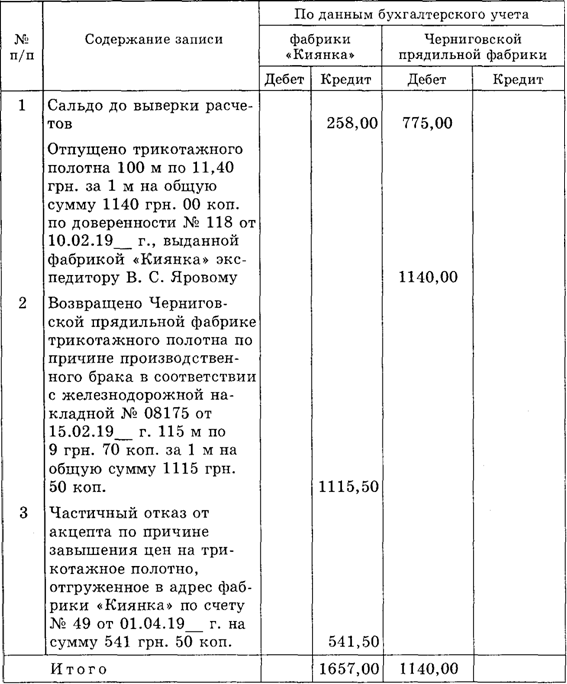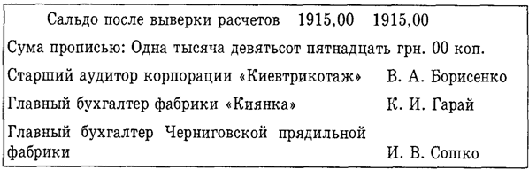 Проведена взаимная выверка расчетов старшим аудитором корпорации «Киевтрикотаж» В. А. Борисенко между фабрикой «Киянка» и Черниговской прядильной фабрикой по состоянию на 19 апреля 19_ г.