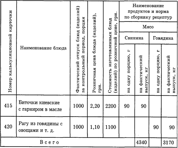 Согласно контрольному расчету расходования продуктов по нормам (табл. 5.4) на приготовление блюд из свинины следовало израсходовать 4340 кг мяса. Фактически согласно расчету, произведенному методом обратной калькуляции (табл. 5.5), первичным документам и отчетам заведующего производством, израсходовано 4215 кг, т.е. недо-вложение в блюда мяса свинины 125 кг (4340 - 4215) на сумму 1125 грн. Одновременно из этих расчетов установлено, что мяса говядины в блюда вложено больше норм на 95 кг на сумму 665 грн., что позволяет сделать вывод: мясо свинины, имеющее цену 9 грн за 1 кг, заменено при приготовлении блюд говядиной, цена которой 7 грн. за 1 кг. Такая незаконная операция позволила работникам столовой «Юность» присвоить выручку в сумме 1125 грн. Аналогичные нарушения технологии приготовления изделий кухни допущены и по другим видам сырья.