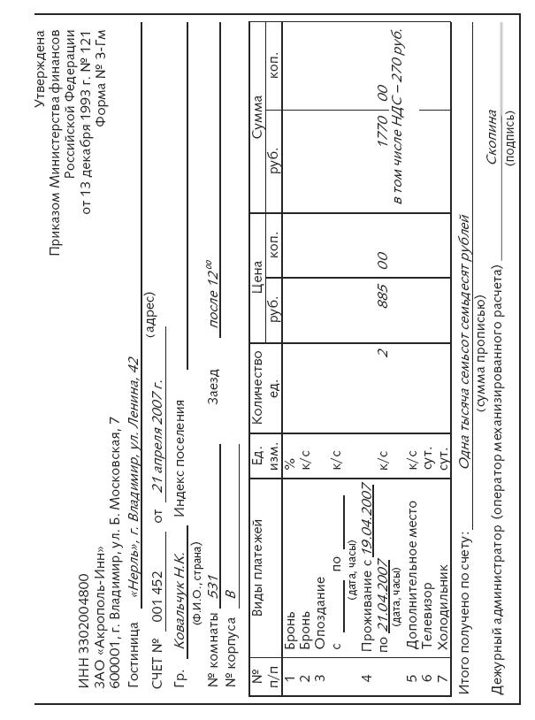 Гостиницы при оказании услуг населению в обязательном порядке должны применять контрольно-кассовые машины (ККМ) при расчетах с населением, в том числе и с иностранными физическими лицами. Если у гостиницы нет кассового аппарата, то работнику должны выдать бланк строгой отчетности – гостиничный счет по форме № 3-Г, утвержденный приказом Минфина России от 13 декабря 1993 г. № 121 «Об утверждении форм документов строгой отчетности».